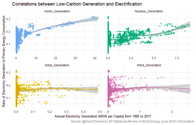 The figure may be a little tricky to understand, but the essence is: Countries that have a lot of hydropower or nuclear power get a larger share of their total energy consumption from electricity. The Y-axes (vertical axes) show what percentage of countries’ energy consumption comes from electricity. And on the X-axis (horizontal axis) you see how much electricity the countries produce with different sources. Every dot on the figure is a country. You see that when countries produce nuclear power and water power, the share of electricity in the countries’ energy consumption increases. This can be seen by the fact that the dots on the far right of the atom and hydrographs are also located at the very top of the Y-axis. You also see that solar and wind energy have no effect on electrification[11].