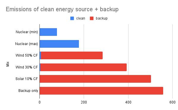 A wind farm with a capacity factor of 30% backed up by a Combined Cycle Gas Turbine would add 30% of the emissions of the wind farm for the electricity it produces to 70% of the emissions of the CCGT for the amount of electrical energy it produces.