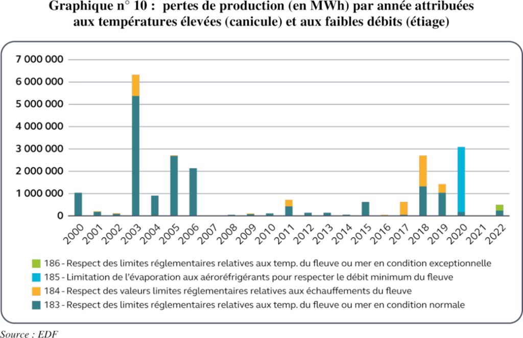 Fig. 1: Production loss of the French nuclear power plant fleet (in MWh) per year due to high temperatures (heat wave) and low flow rates (low water). Source: Cour de comptes/EDF