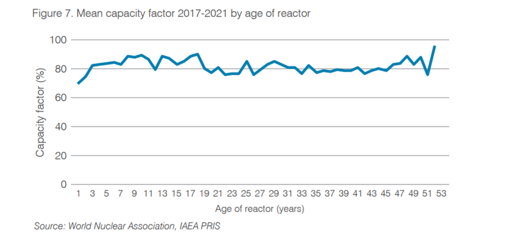 The average global capacity factor has been improved in reactors of all ages, not just new reactors of more advanced design. There is no age-related decline in the performance of nuclear reactors.