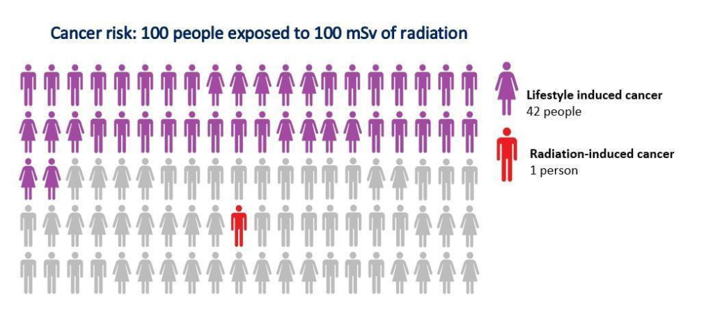 To make a calculation. If we expose 100 people to 100 mSv of radiation, 1 will probably get cancer as a result. Those who would get cancer for other reasons are 42 [3]. As shown in Figure 2.